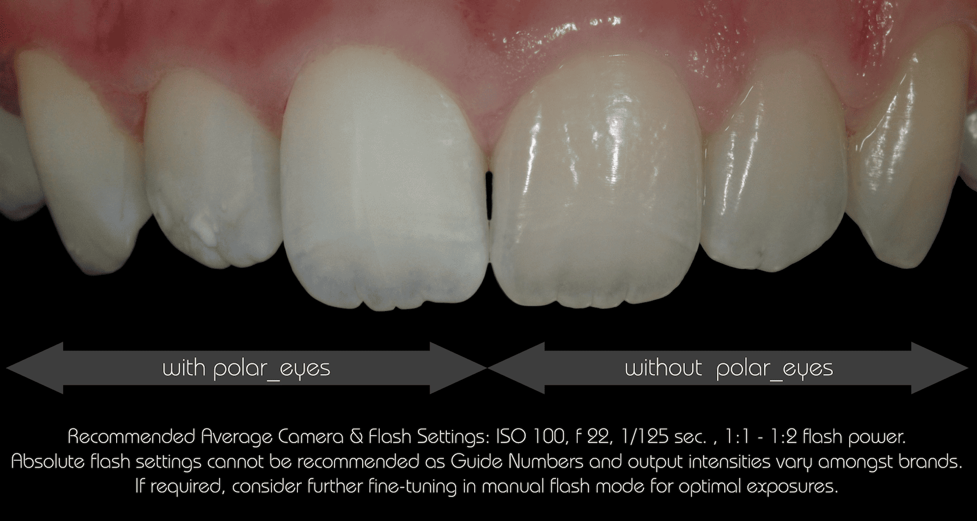 Reflective cross polarised light photography mitigates unwanted specular reflections which obscure the fine details of dental structures, whilst providing a high contrast / hyper-saturated dental image to be objectively analysed via a RAW image workflow such as the proprietery eLAB protocol.